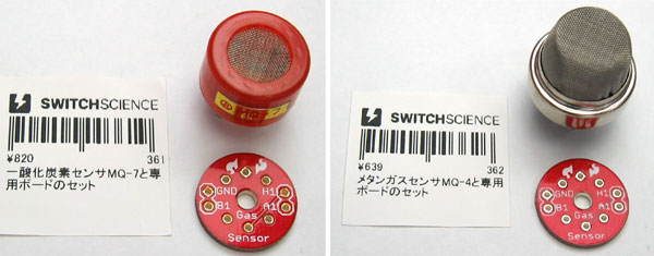 今回はこの中から(一般的なガスセンサーで必要と考えられる)一酸化炭素用(MQ-7)とメタンガス用(MQ-4)を選びました。ご契約のガスにプロパンガスを使用している場合はメタンガス用(MQ-4)よりもLPG液化石油ガス用(MQ-5やMQ-6)の方が良いでしょう。