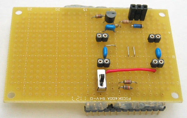 センサーやブザーはピンソケットに接続するようにしました。一番右にメタンガスセンサ、中央付近に一酸化炭素センサ、右上にブザーを装着するようにしています。またセンサーの電源をオフにできるようにスイッチもつけています。スイッチの右側がセンサー出力信号用の負荷抵抗です。一酸化炭素ガス用が10kΩ、メタンガス用が22kΩです。