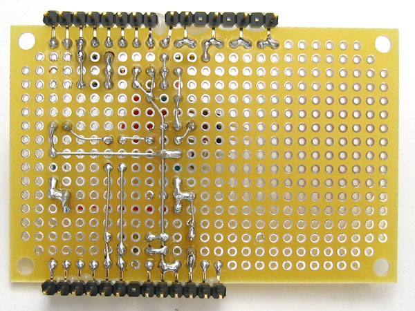 ボクが製作に取り掛かった時点では安価なArduino用ユニバーサル基板が市販されていませんでした。2013年08月に秋月電子通商から「Arduino用ユニバーサル基板」が1枚200円の安価で売られるようになりましたので、そちらを使用するのが良いでしょう。(Arduino用ユニバーサル基板を自作したい方はArduino用のシールドを作成するを参照ください。)