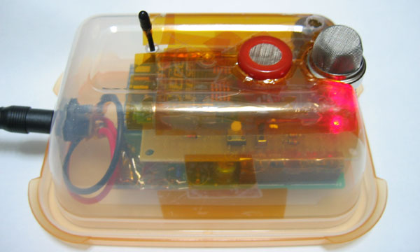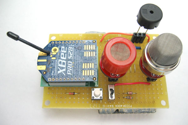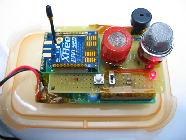 可燃性のガスが発生するような場所で使用する場合は回路を密閉して防爆性を確保しなければなりません。この製作例ではACアダプタ用のDCプラグ、XBeeアンテナ部、ブザー部、ガスセンサ部などに開口があり、またこれらが防爆対策された部品であるかどうかを確認しておりません。とくにブザー駆動時にガスに引火する可能性も考えられます。適切な計測機器を使用し、引火・爆発に対する許容濃度を十分に下回っていることを確認の上で実験するようにして下さい。