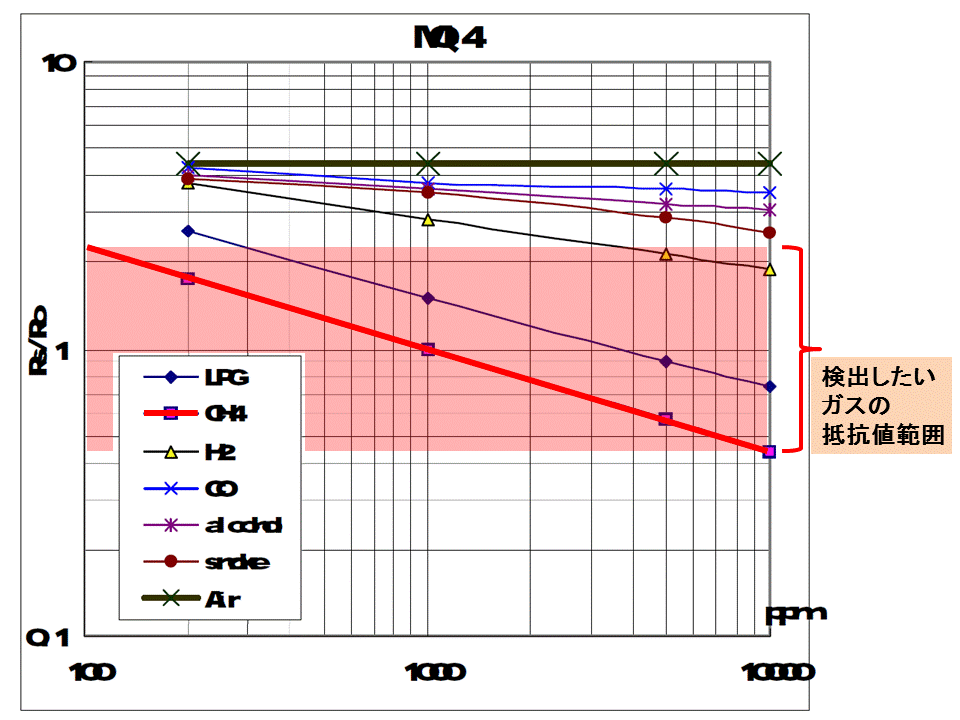 2つめは検出したいガスと検出したくないガスのセンサー抵抗値の範囲の差です。それぞれの全濃度の抵抗値の範囲について重複が無いかを確認します。それぞれのガスの濃度は同じではありませんので、一点の濃度で確認しても意味が無く、全濃度の範囲で考えなけれなりません。例えば1000ppmの部分ではメタンCH4と水素H2との間に差がありますが、H2が5000ppmに達するとCH4が100ppmと同じ抵抗値を示してしまいCH4の測定に影響することが分かります。検出したくないガスが10000ppmを超える場合を考慮するかどうかは、このセンサの目的にもよると思います。(実験レベルでは不要と思います。)
