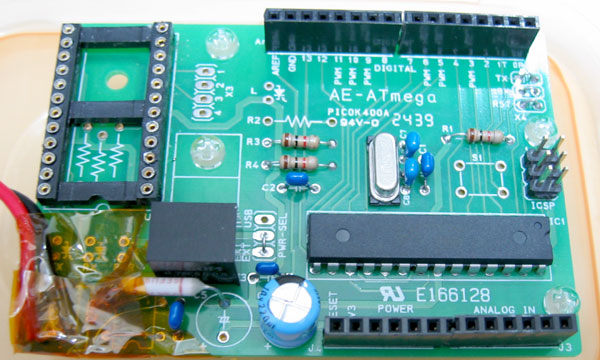 下図にその製作例を示します。なお、普段はUSBシリアル変換モジュールAE-UM232Rを使用しないので脱着式としたり、不要なLEDやリセットスイッチなども省略しました。(但し、AVRマイコンへArduinoブートローダやスケッチを書き込むのにUSBシリアル変換モジュールAE-UM232Rは必要です。)