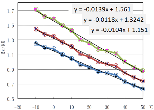 ここではメタンガス用センサMQ4の温度及び湿度の特性を考慮した係数を求めます。湿度が一定の時の係数はデータシートから下図のように直線近似して求めます。グラフは上から順に湿度30%、60%、85%の時のセンサ値(Rs/R0)です。